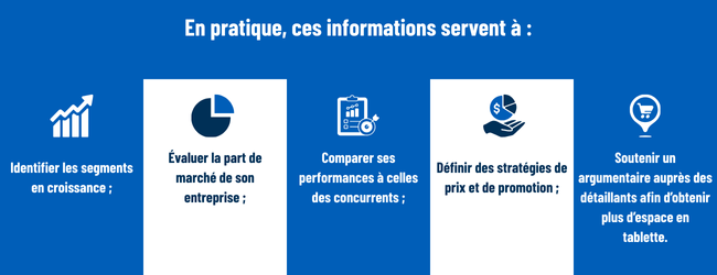 Les données NielsenIQ proviennent directement des détaillants (grandes bannières, épiceries, pharmacies, Walmart, etc.) et reflètent l’ensemble des ventes au pays. Elles permettent de suivre les tendances de marché, d’évaluer la performance de catégories, marques ou produits, et de mieux comprendre le comportement des consommateurs.